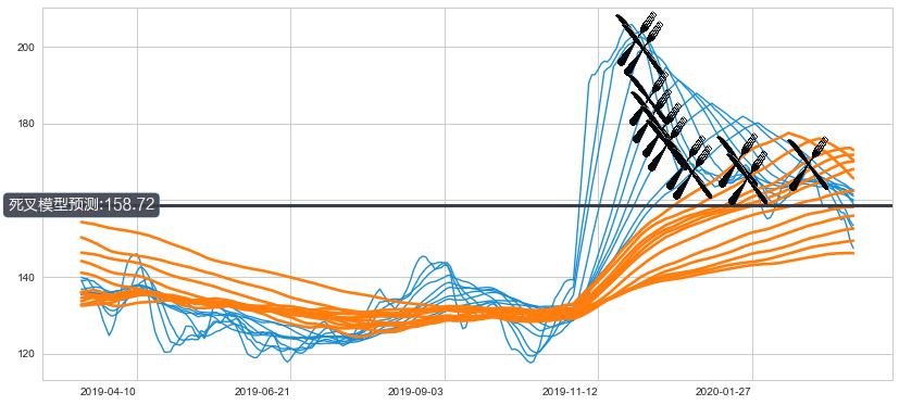 ➣ 70小时均线于(2020-01-17: 169.94)形成【死叉】基于【死叉历史模型】预测死叉后最低波谷价格: 152.85, 死叉后最低价格137.83,已经下跌超出预测最低波谷价格, 预期反弹