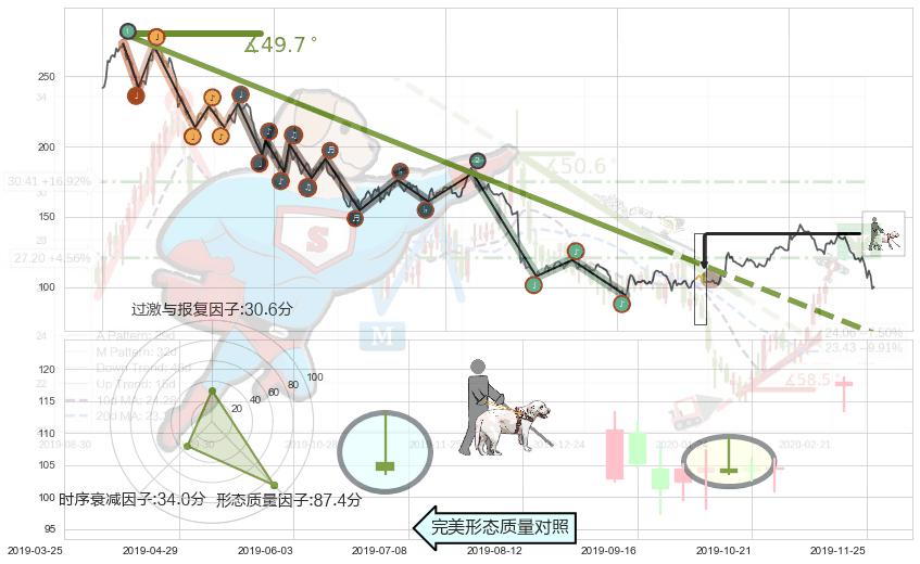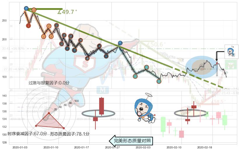 从2018-08-27至2019-03-20,共包含141个交易日,阶段股价下跌-26.34%,阶段股价变动位移路程比: 1 : 9,下跌趋势角度: 66.7
