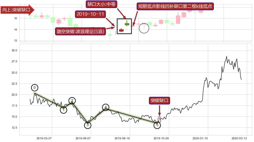 ➣ 突破缺口形成后,后续k已经超过14根,跳空突破波浪理论(5浪)关键点后, 出现【轻微回踩】迹象,短期低点影线回补缺口第二根k线低点