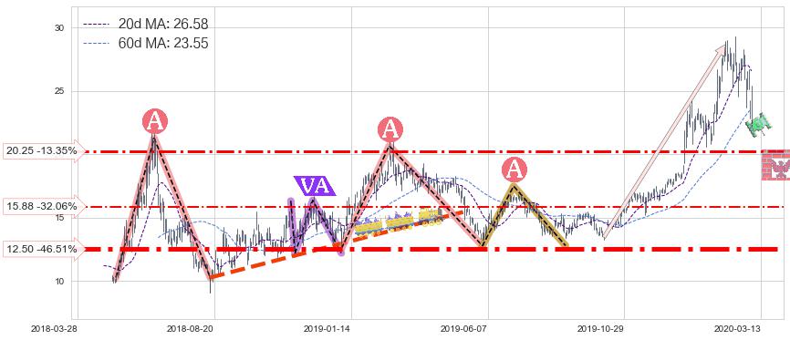 ♘ 支撑价格位20.25,可信任强度60.33%,距离最后交易2020-03-13形成的收盘价格23.37相差 -13.35%