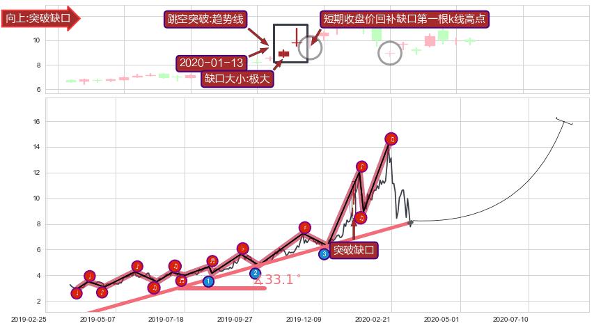 ➣ 突破缺口形成后,后续k已经超过14根,跳空突破趋势线关键点后, 出现【轻微回踩】迹象,短期低点影线回补缺口第二根k线低点