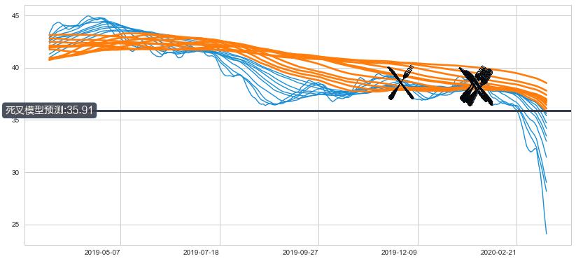 ➣ 70小时均线于(2020-01-21: 38.24)形成【死叉】基于【死叉历史模型】预测死叉后最低波谷价格: 35.80, 死叉后最低价格21.57,已经下跌超出预测最低波谷价格, 预期反弹