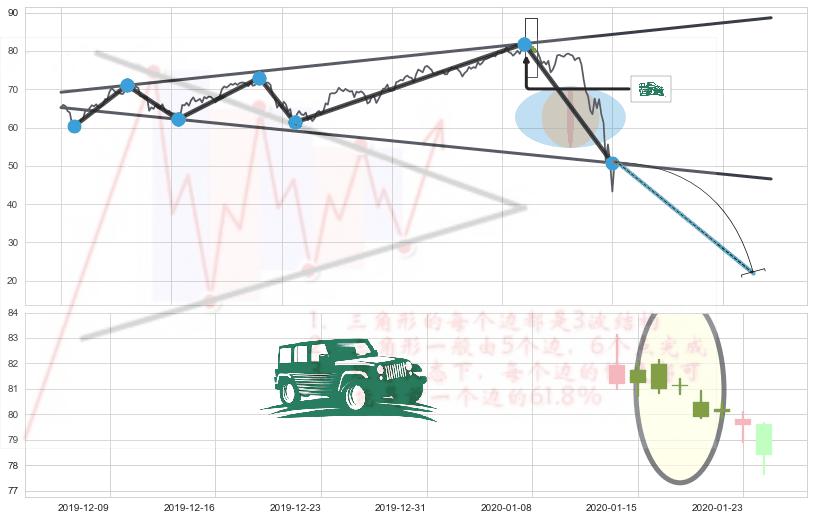 ➣ 【支撑】低点支撑位【③⑤⑦】一底低于一底,构成扩散三角的下斜边