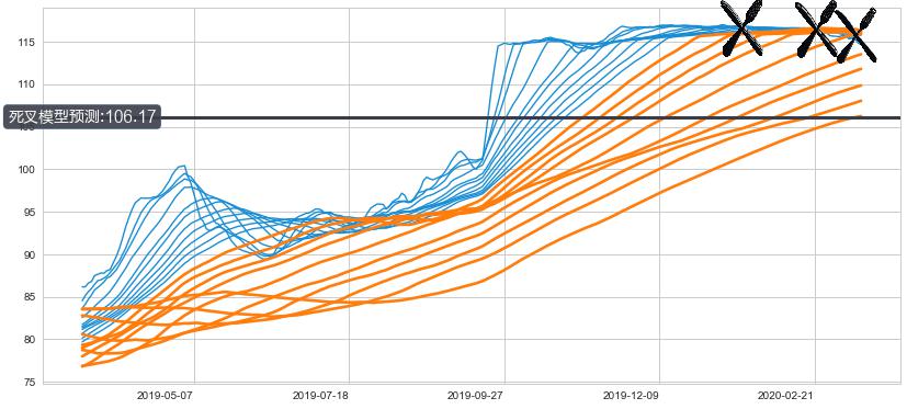 ➣ 80小时均线于(2020-02-21: 116.30)形成【死叉】基于【死叉历史模型】预测死叉后最低波谷价格: 101.94, 死叉后最低价格113.01,尚未达到预测最低波谷价格, 预期继续下跌