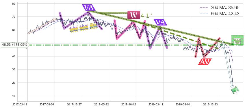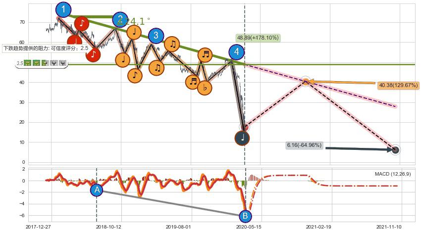♘ 在最后的下跌阶段2018-01-29至2020-03-13,存在 持续未破位的阻力位 ,阻力价格48.89,可信任强度67.17%,其距离最后价格17.58相差 +178.10%
