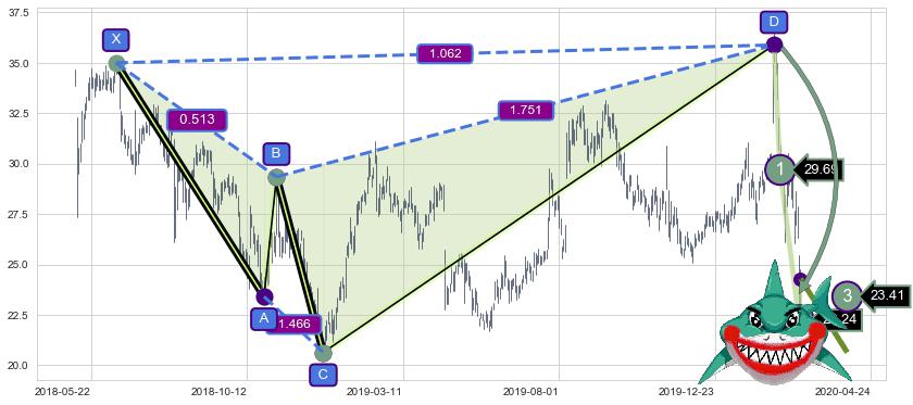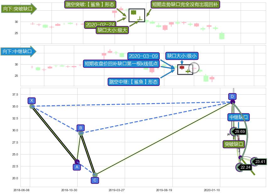 ➣ 已完成【鲨鱼】形态起点X: 2018-06-14, 终点D: 2020-02-19, 共423交易日