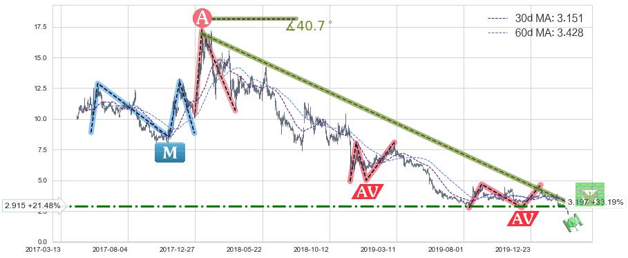 🦴 长线均值回复组合短线趋势跟踪[强阻力信号]2018-01-11-2020-03-13下跌趋势依然成立(下跌趋势跟踪依然存在),短线价格略微上行反弹(均值回复猜想),即将接近下跌趋势提供的未破位阻力价格:3.197。