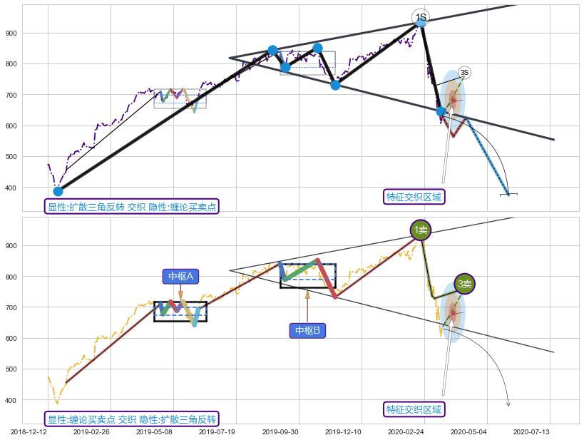 ➣ 缠论买卖点:上升缠:临近3卖-猜想击穿破位3卖后延续下跌趋势(大周期趋势均值回复后小周期持续趋势跟踪)