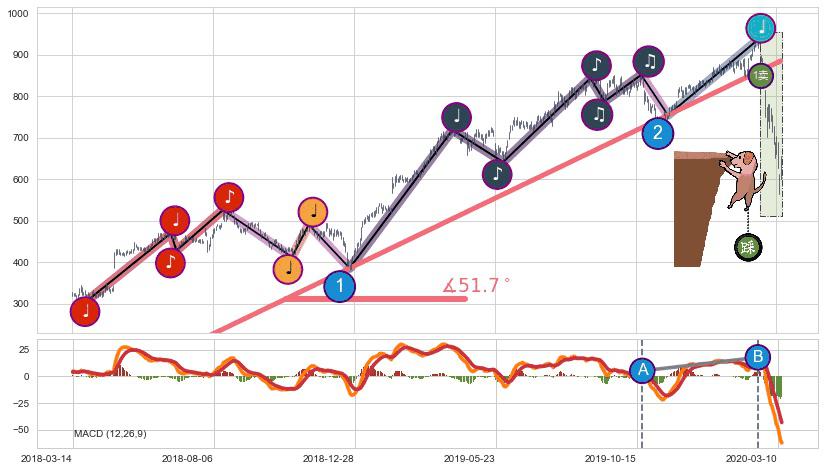 ➣ 2018-04-02-2020-03-11上升趋势存在反转[风险],其原上升趋势的支撑位(885.22)已破位[强阻力信号],原上升趋势角度: 51.7˚