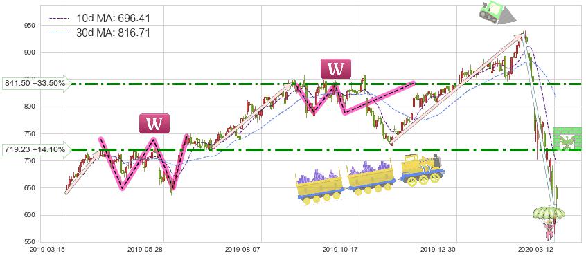 ♘ 阻力价格位841.50,可信任强度63.72%,距离最后交易2020-03-13形成的收盘价格630.36相差 +33.50%