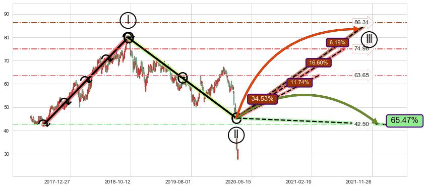 ♘ 在最后的下跌阶段2018-05-17至2020-03-13,存在 持续未破位的阻力位 ,阻力价格63.27,可信任强度62.38%,其距离最后价格31.38相差 +101.62%