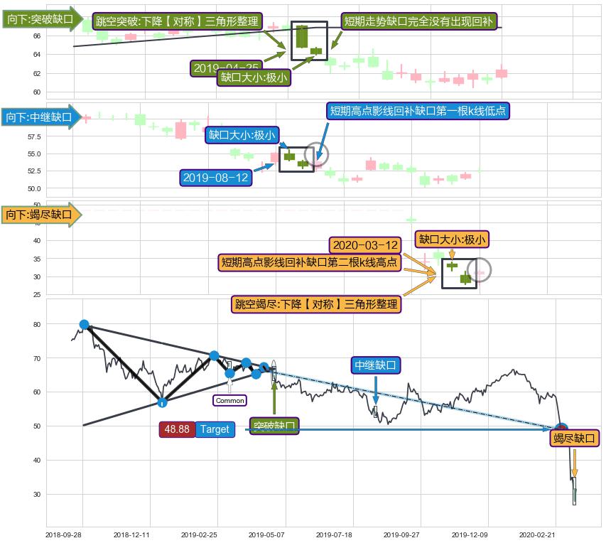 ➣ 普通缺口在【下降【对称】三角形整理】震荡整理形态中出现