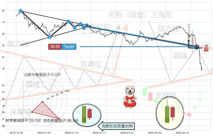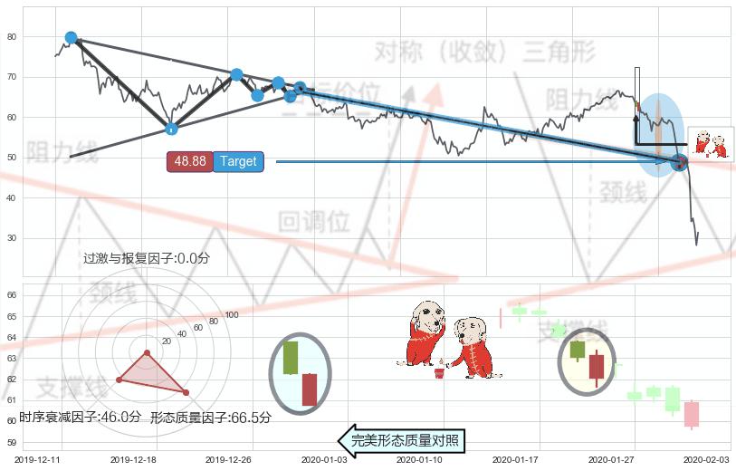 ➢ 上涨身怀六甲 🔜 下降对称三角整理target支撑拐点上涨 综合量化分数:50.31 【中性】