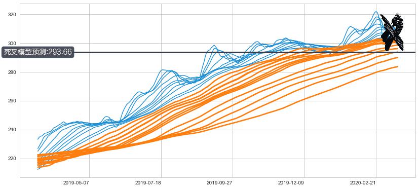 ➣ 70小时均线于(2020-03-10: 303.22)形成【死叉】基于【死叉历史模型】预测死叉后最低波谷价格: 293.59, 死叉后最低价格279.85,已经下跌超出预测最低波谷价格, 预期反弹
