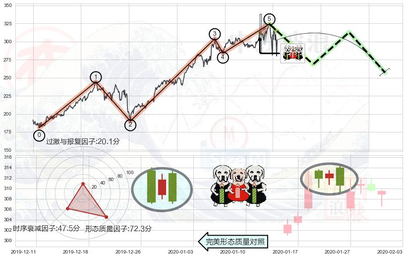 ➢ 🕰 价格走势在2020-01-27至2020-01-28期间形成顶部尽头线(下山虎),残存影响值:-3.11