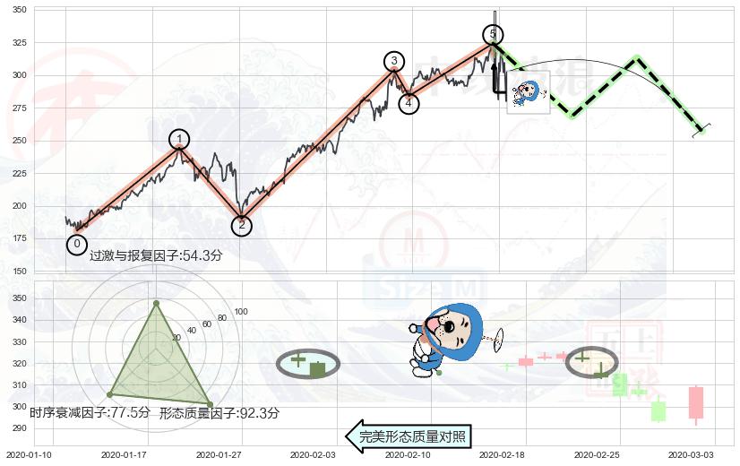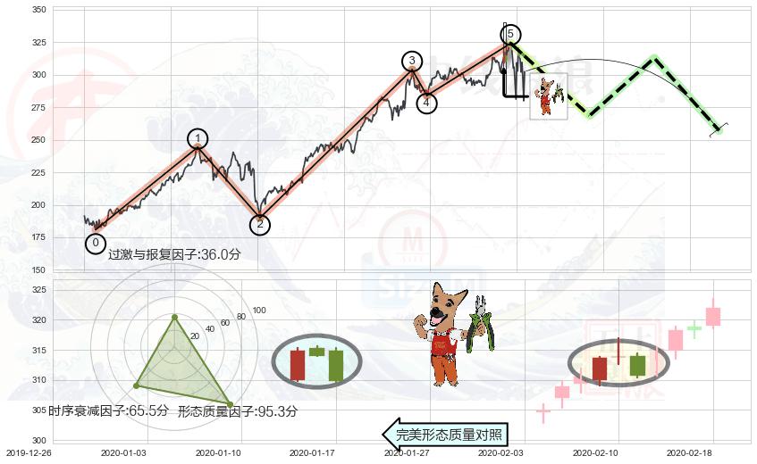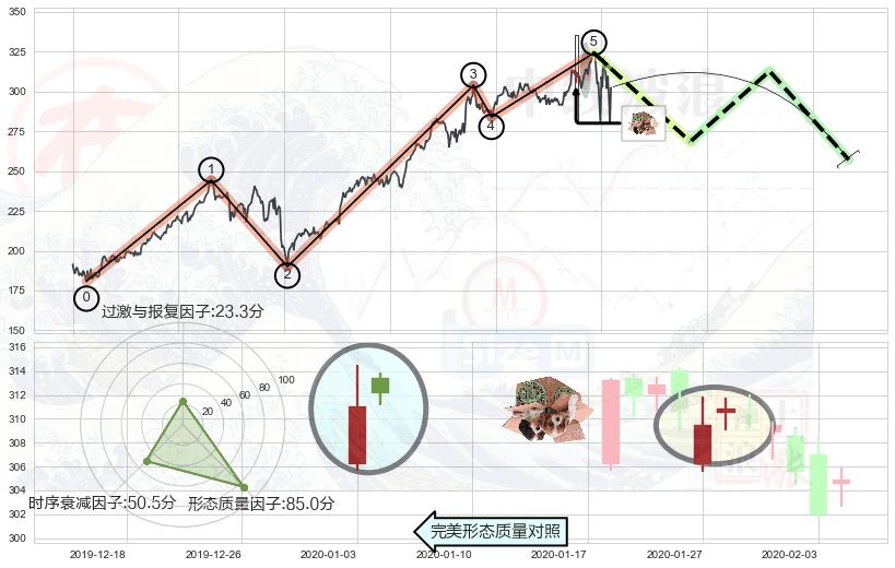 ➣ 顶部尽头线(下山虎) + 波浪理论上涨浪:浪5回调拐点信号叠加后【反向回撤率】低,【看空】信号叠加【存续影响大】