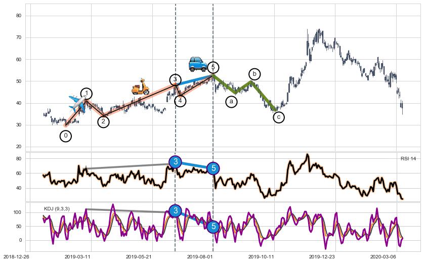 ➢ 锯齿型:子浪535结构 ⓑ点振幅较小,ⓒ点继续发力远超ⓐ点结束位置