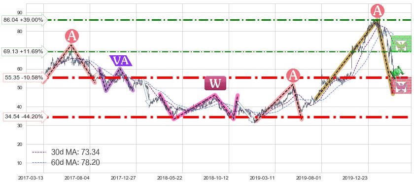 ♘ 支撑价格位55.35,可信任强度87.78%,距离最后交易2020-03-13形成的收盘价格61.90相差 -10.58%