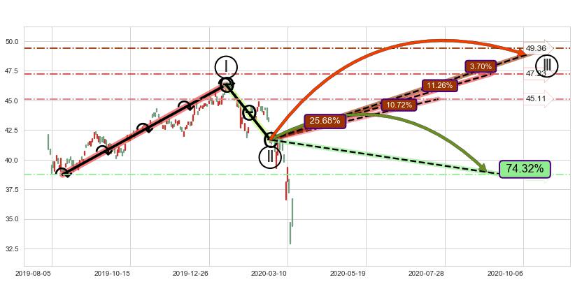 ➢ 循环浪继续向上【最低】位置(2020-07-22, 45.11),匹配聚类样本比例41.74%, 可能性概率10.72%