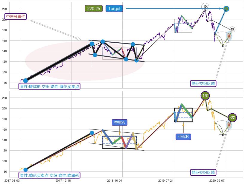 ➣ 顶部尽头线(下山虎) + 降旗形临近target阻力拐点下跌信号叠加后【信号初始稳固度】中等,【看空】信号叠加【可信度影响中等】