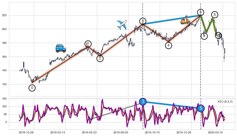 ➢ 上升趋势【顶点B】比【顶点A】高⤴️,【KDJ】指标【顶点B】比【顶点A】低⤵️