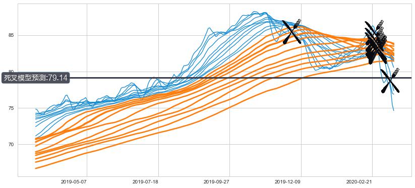 ➣ 55小时均线于(2020-02-26: 82.65)形成【死叉】基于【死叉历史模型】预测死叉后最低波谷价格: 78.94, 死叉后最低价格70.01,已经下跌超出预测最低波谷价格, 预期反弹