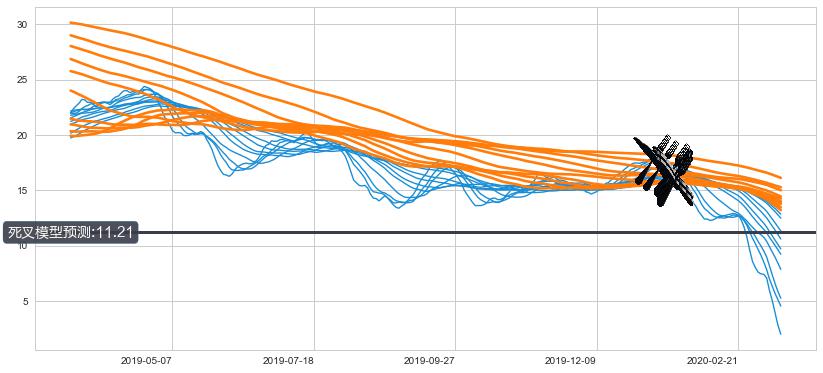 ➣ 21小时均线于(2020-01-10: 17.16)形成【死叉】基于【死叉历史模型】预测死叉后最低波谷价格: 14.82, 死叉后最低价格1.4200,已经下跌超出预测最低波谷价格, 预期反弹