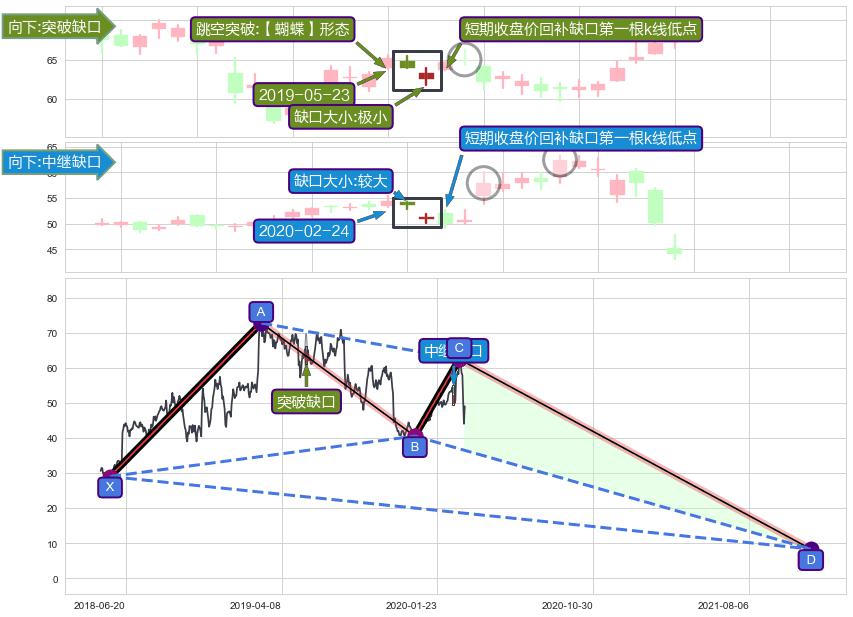 ➣ 突破缺口形成后,后续k已经超过14根,跳空突破【蝴蝶】形态关键点后, 出现【完全回踩】迹象,短期收盘价回补缺口第一根k线低点
