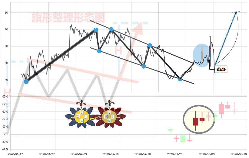 ➢ 收盘价(2020-03-04: 62.46 )→再次回踩→第一根k线低点(2020-02-21: 52.84 )