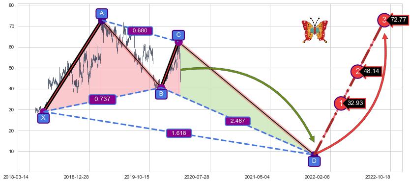 ➣ 未完成【蝴蝶】形态起点X: 2018-05-22, 已到达C点: 2020-03-04, 预测最终D点: 2021-11-25, 共899交易日