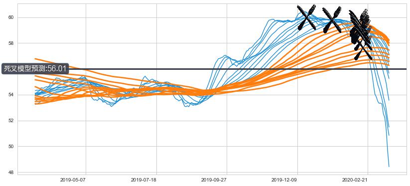 ➣ 120小时均线于(2020-02-14: 58.35)形成【死叉】基于【死叉历史模型】预测死叉后最低波谷价格: 54.85, 死叉后最低价格44.80,已经下跌超出预测最低波谷价格, 预期反弹