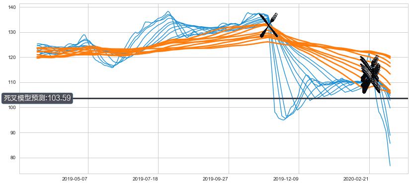 ➣ 40小时均线于(2020-02-24: 111.47)形成【死叉】基于【死叉历史模型】预测死叉后最低波谷价格: 102.46, 死叉后最低价格65.04,已经下跌超出预测最低波谷价格, 预期反弹