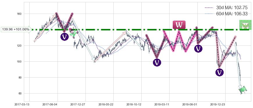 ♘ 阻力价格位139.96,可信任强度99.00%,距离最后交易2020-03-13形成的收盘价格69.63相差 +101.00%