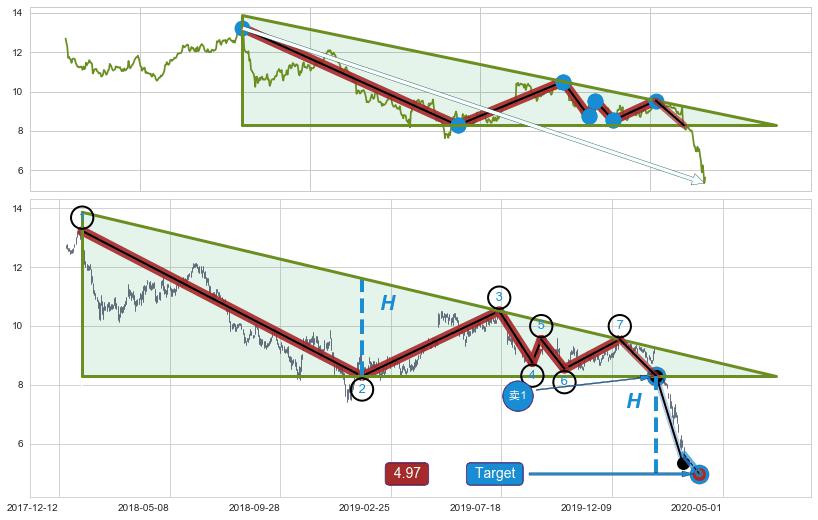 ➢ 【多方力量耗尽,空方打破攻守平衡点】下降三角形中继整理, 已在2020-02-06突破【支撑】颈线 8.29 →演变成下降通道