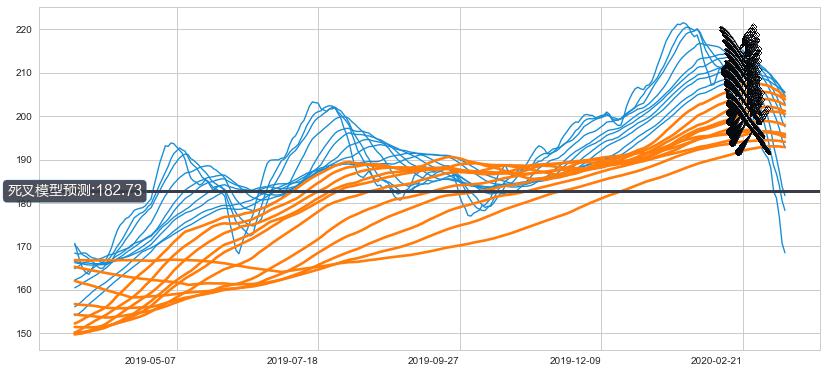 ➣ 90小时均线于(2020-02-21: 203.33)形成【死叉】基于【死叉历史模型】预测死叉后最低波谷价格: 180.54, 死叉后最低价格154.47,已经下跌超出预测最低波谷价格, 预期反弹
