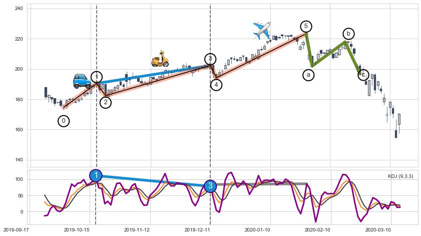 ➣ 第一, 三驱动浪端点:【KDJ】走势出现【常规背离 & 反转信号】背离程度83.33%,背离夹角角度44.7˚,背离程度较小