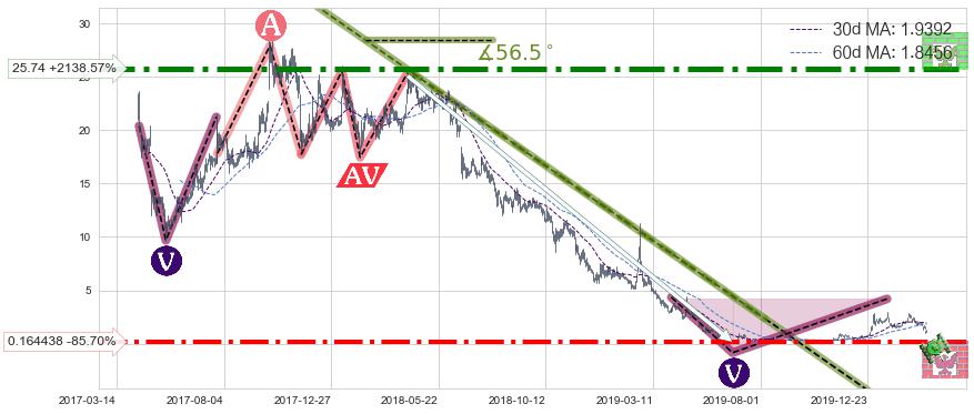 从2017-10-05至2019-08-07,共包含462个交易日,阶段股价下跌-271.27%,阶段股价变动位移路程比: 1 : 7,下跌趋势角度: 56.5