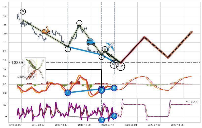 ➣ 5.1: 预测当前第5浪位置(2020-03-12, 1.3800),仍然有下跌空间