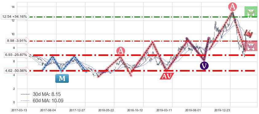 ♘ 支撑价格位6.93,可信任强度95.20%,距离最后交易2020-03-13形成的收盘价格9.35相差 -25.87%
