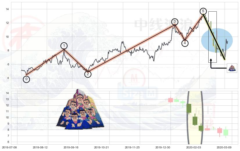 ➣ 波浪理论:猜想击穿破位c点后继续下跌 → 下跌 → 风险信号 → 小趋势跟踪