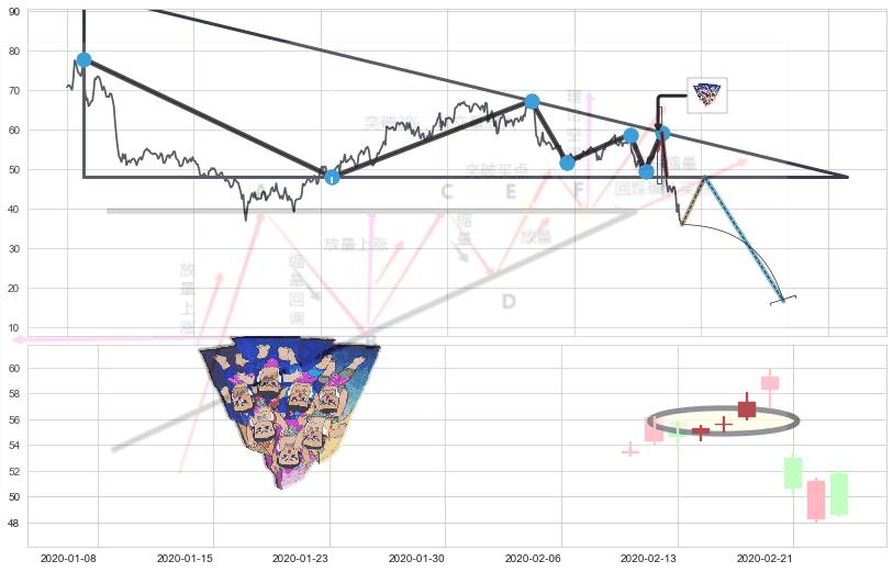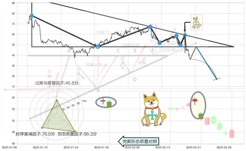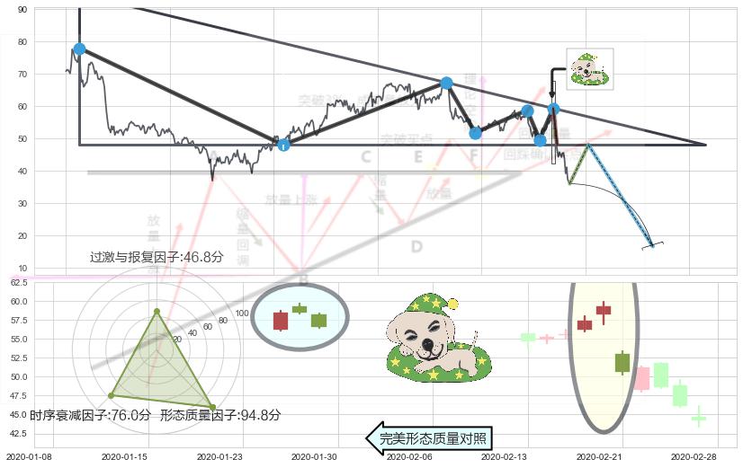 ➢ 【多方力量耗尽,空方打破攻守平衡点】下降三角形中继整理, 已在2020-02-26突破【支撑】颈线 48.00 →演变成下降通道