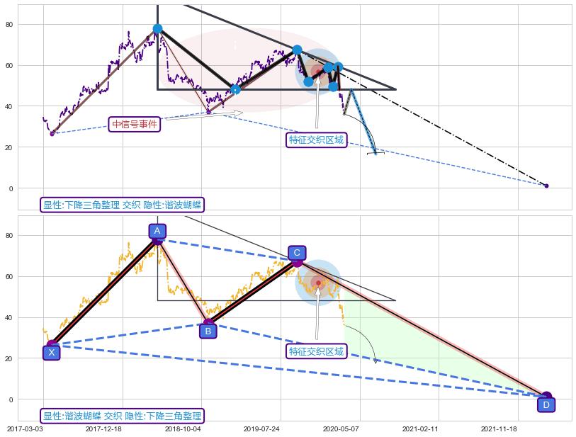 ➢ 下降三角整理属【中级别信号事件】谐波蝴蝶属【长级别信号事件】中长周期组合信号事件,中长事件长度比62.21%