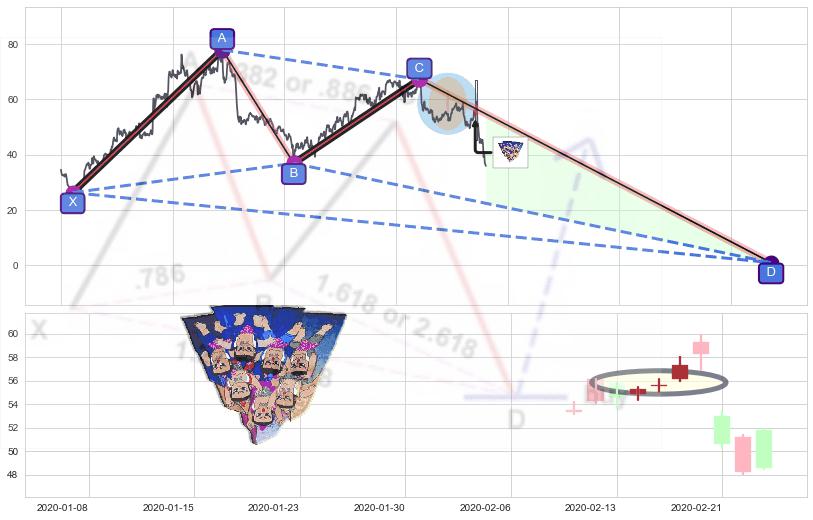 ➢ 谐波蝴蝶:猜想c点拉升接近b点后强阻力来临下沉下跌(均值回复)