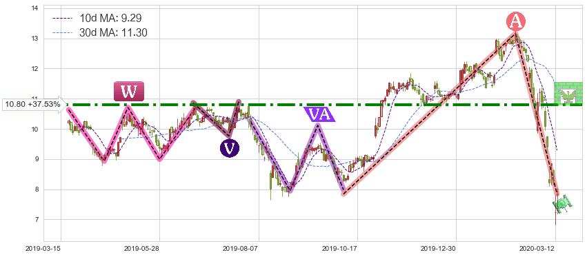 ♘ 阻力价格位10.80,可信任强度83.38%,距离最后交易2020-03-13形成的收盘价格7.85相差 +37.53%