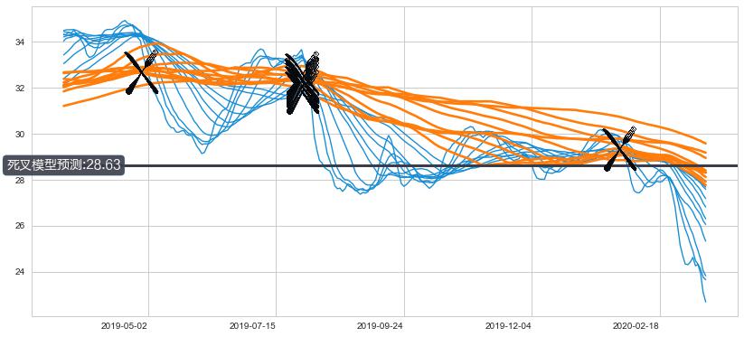 ➣ 120小时均线于(2019-04-29: 32.65)形成【死叉】基于【死叉历史模型】预测死叉后最低波谷价格: 29.43, 死叉后最低价格20.47,已经下跌超出预测最低波谷价格, 预期反弹