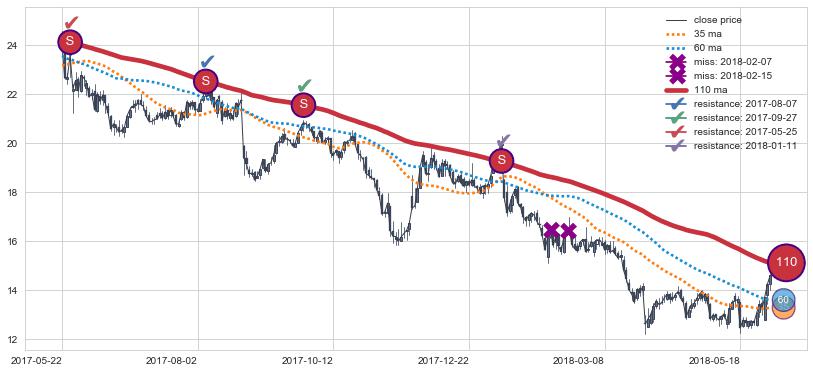 ➢ 最优均线组合共正确确认支撑阻力信号6处,正确确认率 54.55%