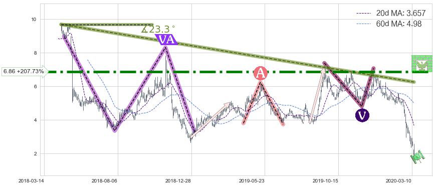 ➢ 【多方力量耗尽,空方打破攻守平衡点】下降三角形中继整理, 已在2020-02-21突破【支撑】颈线 5.03 →演变成下降通道