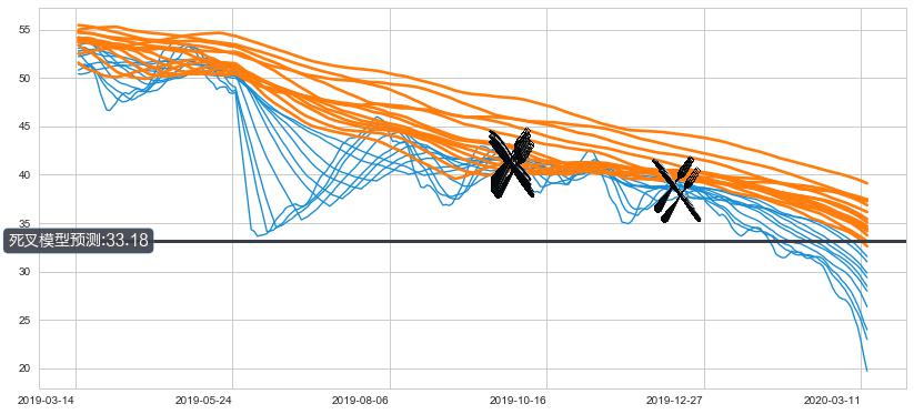 ➢ 21小时均线于(2019-12-16: 37.75)形成【死叉】基于【死叉历史模型】预测死叉后最低波谷价格: 33.10, 死叉后最低价格17.00,已经下跌超出预测最低波谷价格, 预期反弹