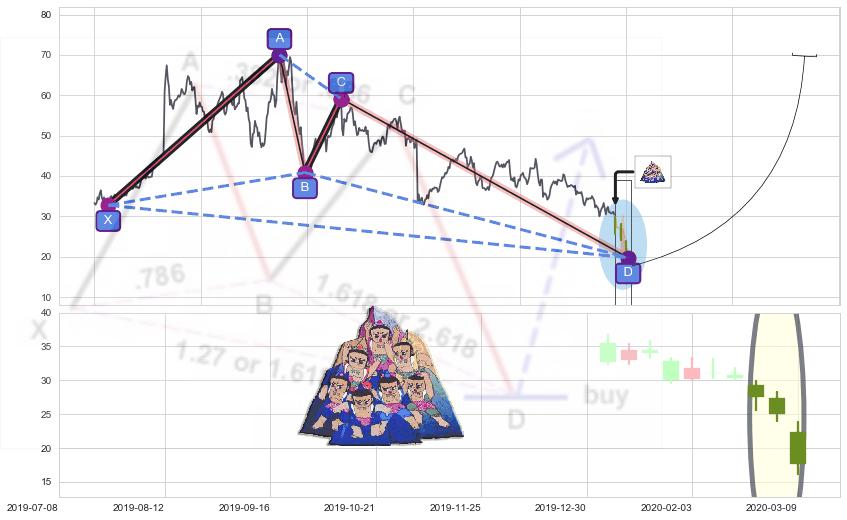 ➣ 谐波蝴蝶:c下跌到达d:猜想拉升 → 上涨 →【拐点】强支撑临近 → 大趋势均值回复