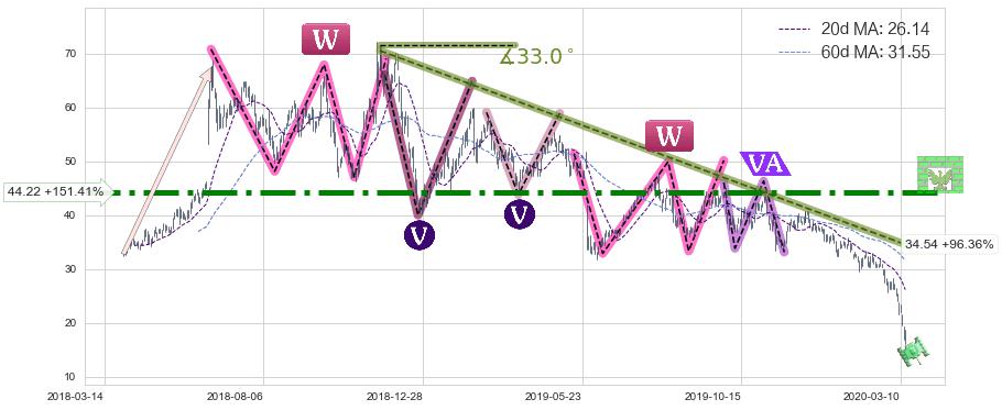 从2018-11-16至2020-03-13,共包含331个交易日,阶段股价下跌-114.37%,阶段股价变动位移路程比: 1 : 7,下跌趋势角度: 33.0